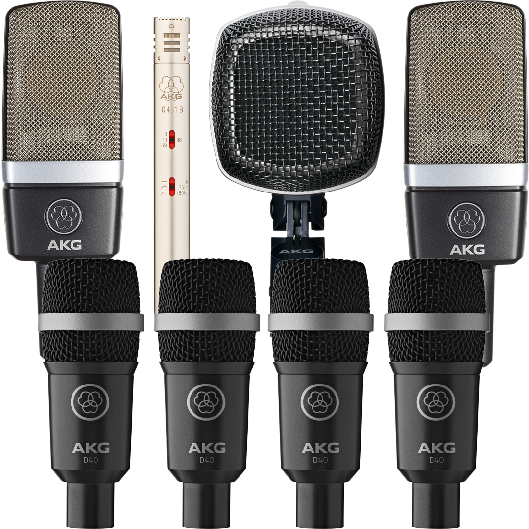 Elevate your drum sound with the Drum Set Premium reference drum microphone set, meticulously hand-selected for touring, live, and studio applications. Housed in a rugged metal carry case, this collection of top-tier AKG microphones ensures both exceptional sound capture and secure transportation. Handpicked in Vienna, Austria, the set includes 8 world-class microphones: 1 D12 VR dynamic bass drum mic, 1 matched pair of C214 condenser mics for overheads, 1 C451 B condenser mic for Hi-Hat, and 4 D40 dynamic instrument mics for snare and toms. Rent a professional-grade drum mic setup with the AKG Premium Drum Mic Kit.