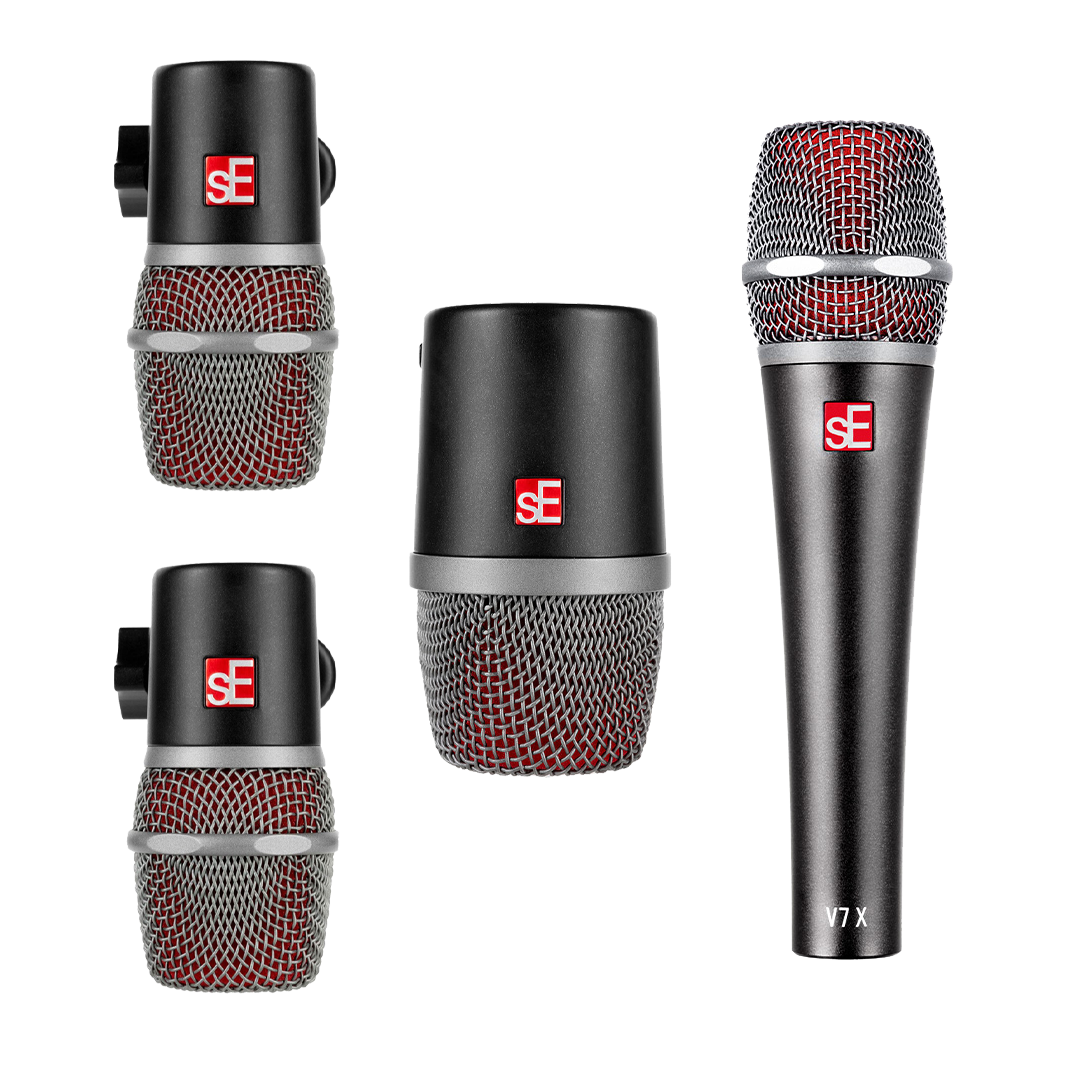 The sE V Pack Venue is made for miking complete drum kits. This kit contains the V Beat mic for toms and snare, the innovative V Kick for Kick drums and the V7x for snare. This kit is designed for a 2-3 piece drum kit but can be used for other percussion instruments as well , or any other instrument for that matter. All mic come contained in a custom made case ready to go with mic clips and clamps for easy and fast application.