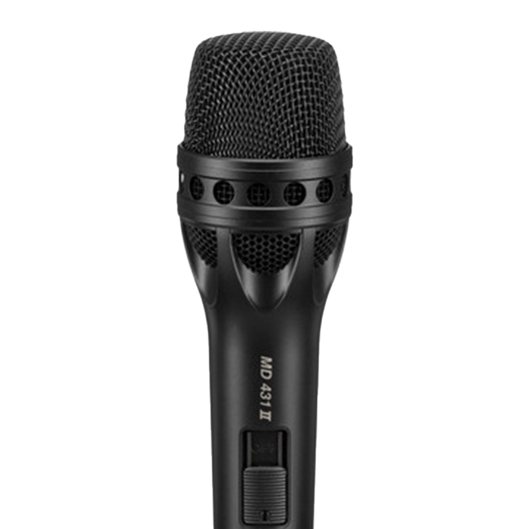 The Sennheiser MD431 II is a handheld supercardioid dynamic microphone designed for clear, detailed vocal and speech reproduction in live settings such as concerts, public address systems, houses of worship, and stage performances. With a broad frequency response of 40 Hz to 18 kHz, its dynamic element operates without the need for external power. The supercardioid pattern effectively rejects off-axis sound, minimizing feedback and unwanted coloration. Additionally, a hum-compensating coil helps reduce electrical interference, ensuring clean audio capture in any environment.