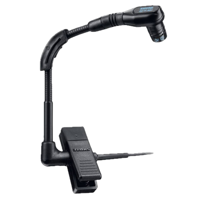 The Beta 98H/C is a premium cardioid condenser instrument microphones that clamps onto the bell of wind instruments or onto the rim of percussion instruments. The integrated gooseneck and ratcheting swivel joint allows the mic to be easily positioned and secured, and an isolation shock-mount reduces the transmission of instrument 'key noise' and other mechanical noise. A gooseneck angle brace is included to provide better retention of the microphone placement during more active performances. - Shure.com