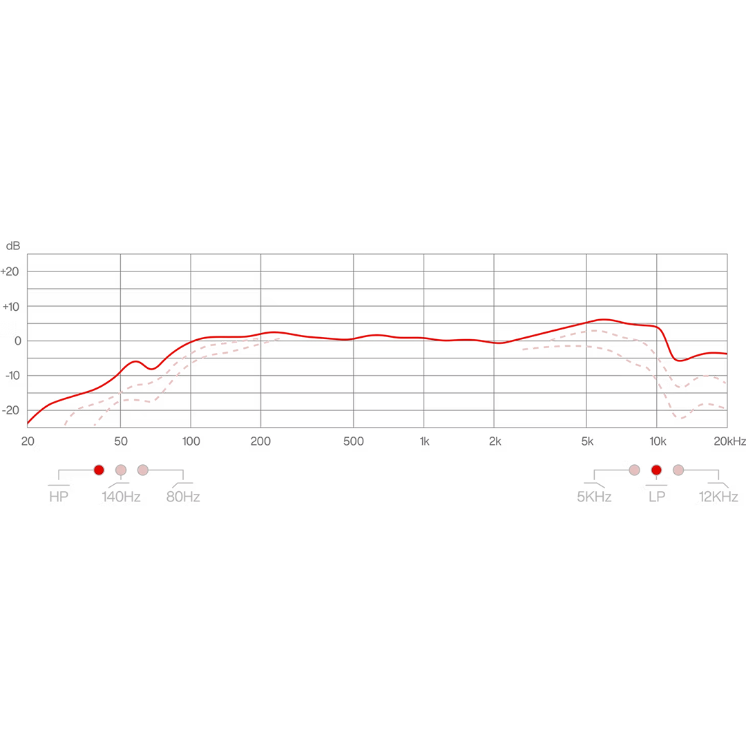 The microphone’s Air Coupling Modes control airflow and low-frequency energy, reducing unwanted buildup while keeping the punch and definition of the beater intact. An onboard highpass and lowpass filter system makes it easy to dial in the perfect tone for any style or drum setup.