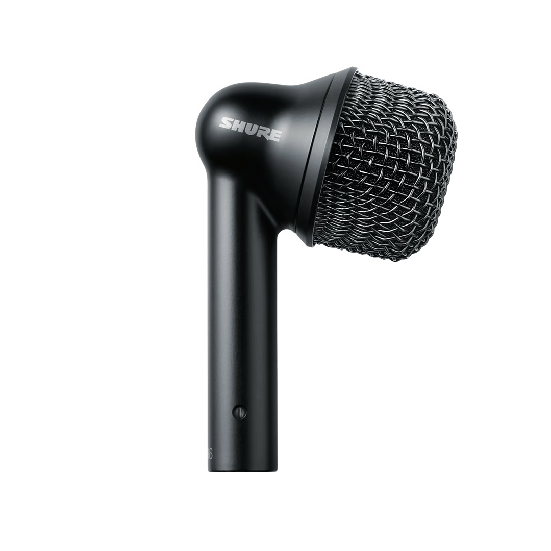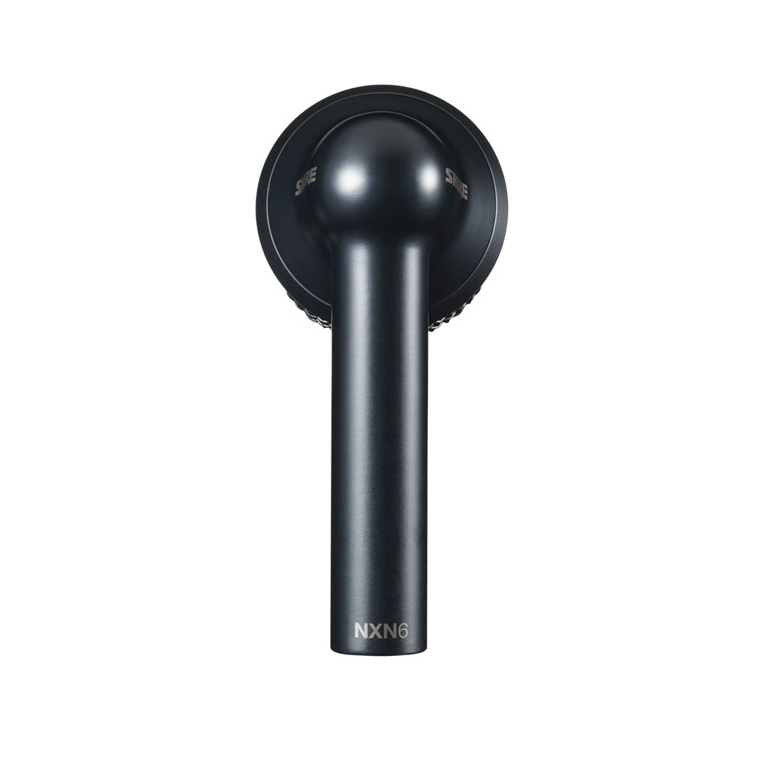 The Shure Nexadyne 6 is a compact, supercardioid dynamic microphone designed to deliver clear highs, flat mids, and a full low-end response for toms, snare drums, and percussion, while minimizing unwanted cymbal bleed and noise through its Revonic Dual-Engine Transducer. Built for professional touring, it features a discreet, fixed-angle design and a small drum mount that resists shifting due to vibrations—an issue common with drum-mounted mics—while its compact capsule helps prevent accidental hits. Mechanical isolation further reduces noise by eliminating ringing and buzzing caused by vibration transfer, and the Nexadyne 6 comes complete with an A6D drum mount, a zippered bag, and a brass 3/8" thread adapter.